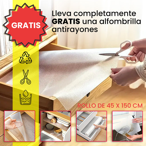 Llévate gratis un rollo de alfombrilla reutilizable para proteger tus cajones de grasa, humedad y rayaduras.