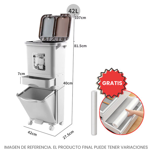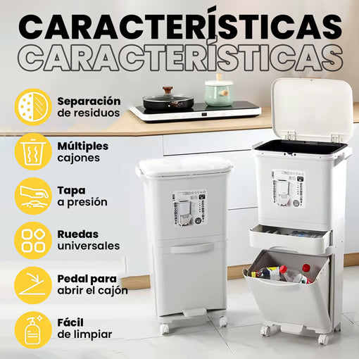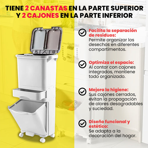 Olvídate de los basureros tradicionales. Su diseño moderno se integra perfectamente en cualquier espacio: cocina, patio, estudio, sala o cualquier área donde necesites un basurero funcional y organizador al mismo tiempo.