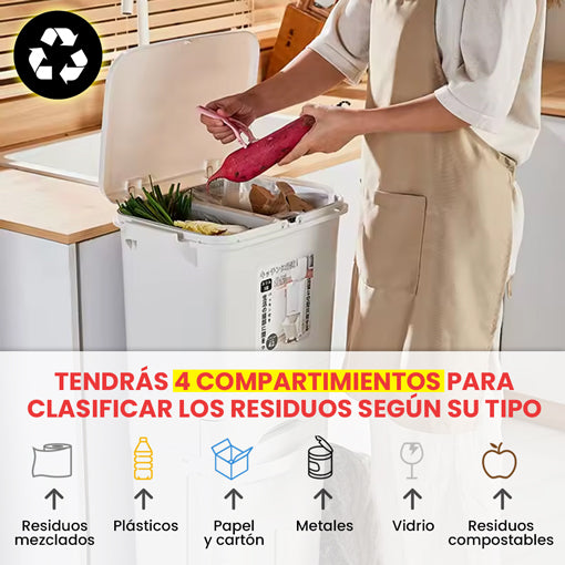 cuenta con dos compartimentos superiores, ideales para diferenciar desechos reciclables y no reciclables.