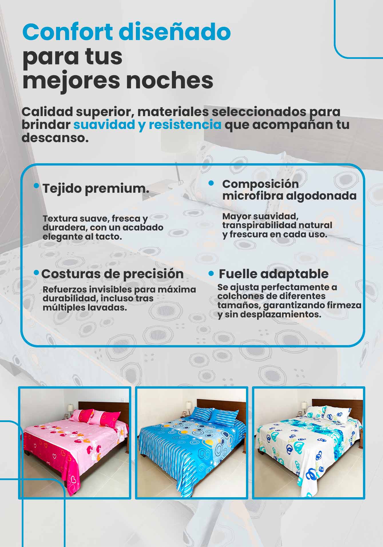 - Nuestras sábanas tienen 100% microfibra algodonada calidad premium.